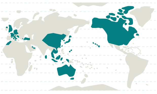 韓国、シンガポール、スリランカ、タイ、台湾、中国、カンボジア、ベトナム、香港、マレーシア、モンゴル、日本、インドネシア