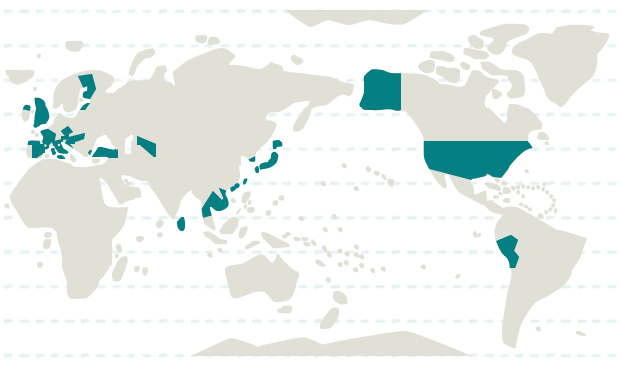 イギリス、イタリア、ウズベキスタン、エストニア、オーストリア、クロアチア、スペイン、チェコ、トルコ、バチカン、ハンガリー、フィンランド、フランス、ラトビア