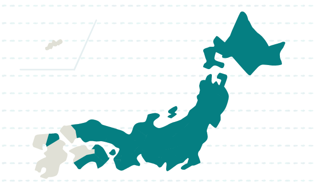 北海道、青森、岩手、宮城、秋田、山形、福島、茨城、栃木、群馬、埼玉、千葉、東京、神奈川、新潟、富山、石川、福井、山梨、長野、岐阜、静岡、愛知、三重、滋賀、京都、大阪、兵庫、奈良、和歌山、鳥取、島根、岡山、広島、徳島、香川、高知、福岡