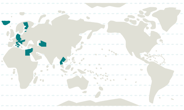 アイスランド、イタリア、ウズベキスタン、エストニア、オーストリア、クロアチア、スロベニア、チェコ、デンマーク、ドイツ、トルクメニスタン、バチカン、ハンガリー、フィンランド、ボスニア・ヘルツェゴビナ