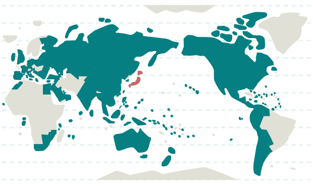 オーストラリア、北マリアナ諸島(サイパン)、グアム、ソロモン諸島、トンガ、ニュージーランド、バヌアツ、パラオ、フィジー、クック諸島、サモア、フランス領ポリネシア(タヒチ)、マーシャル諸島、ミクロネシア連邦、キリバス、ツバル、ナウル、パプアニューギニア