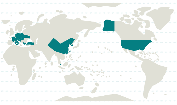 イタリア、ウクライナ、オーストリア、ギリシャ、クロアチア、スイス、スロバキア、スロベニア、チェコ、ドイツ、トルコ、バチカン、ハンガリー、フランス、ポーランド