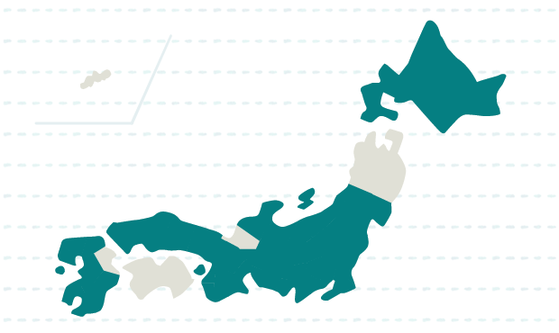 北海道、宮城、山形、福島、茨城、栃木、群馬、埼玉、千葉、東京、神奈川、新潟、富山、石川、山梨、長野、岐阜、静岡、愛知、三重、滋賀、京都、大阪、兵庫、奈良、和歌山、鳥取、島根、岡山、広島、山口、福岡、佐賀、長崎、熊本、宮崎、鹿児島