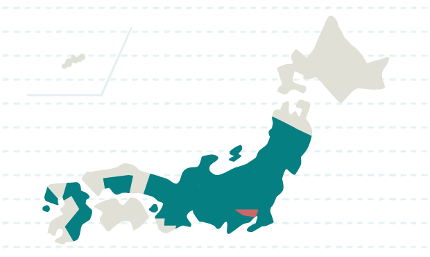 岩手、宮城、秋田、山形、福島、茨城、栃木、群馬、埼玉、千葉、東京、神奈川、新潟、富山、石川、福井、山梨、長野、岐阜、静岡、愛知、三重、滋賀、京都、大阪、兵庫、奈良、広島、福岡、長崎、大分、宮崎