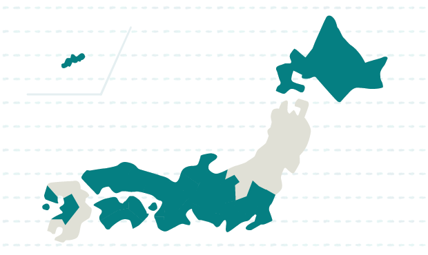 北海道、茨城、栃木、埼玉、千葉、東京、神奈川、富山、石川、福井、山梨、長野、岐阜、静岡、愛知、三重、滋賀、京都、大阪、兵庫、奈良、和歌山、鳥取、島根、岡山、広島、山口、徳島、香川、愛媛、高知、長崎、熊本、沖縄