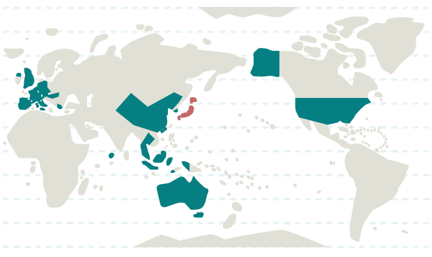 日本、インドネシア、韓国、シンガポール、タイ、中国、香港、マカオ、マレーシア、モルディブ