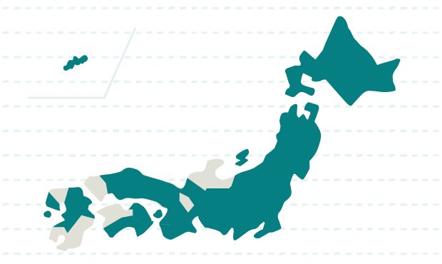 北海道、青森、岩手、宮城、秋田、山形、福島、茨城、栃木、群馬、埼玉、千葉、東京、神奈川、新潟、福井、山梨、長野、岐阜、静岡、愛知、三重、京都、大阪、兵庫、奈良、和歌山、鳥取、島根、岡山、広島、徳島、香川、高知、福岡、長崎、熊本、大分、沖縄