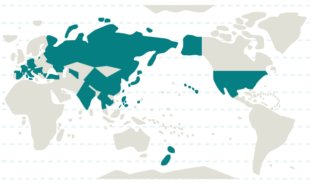 日本、インド、韓国、カンボジア、北朝鮮、タイ、台湾、中国、フィリピン、ミャンマー