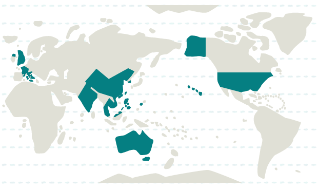 インド、韓国、カンボジア、タイ、台湾、中国、フィリピン、ベトナム、香港、マカオ、マレーシア