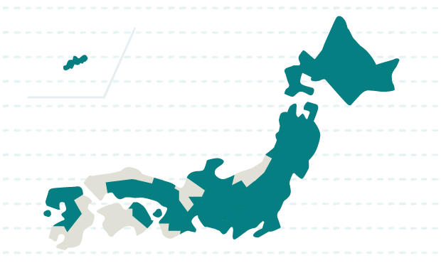 北海道、青森、岩手、宮城、秋田、山形、福島、茨城、栃木、群馬、埼玉、千葉、東京、神奈川、富山、石川、山梨、長野、岐阜、静岡、愛知、三重、京都、大阪、兵庫、奈良、岡山、広島、徳島、香川、福岡、佐賀、長崎、熊本、沖縄