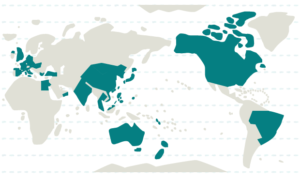 インド、韓国、北朝鮮、シンガポール、タイ、台湾、中国、フィリピン、ベトナム、香港、マカオ、マレーシア、モンゴル、日本