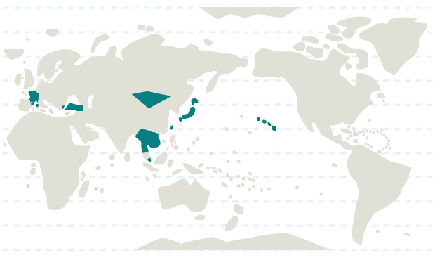 カンボジア、シンガポール、タイ、台湾、ベトナム、ミャンマー、ラオス、日本、モンゴル