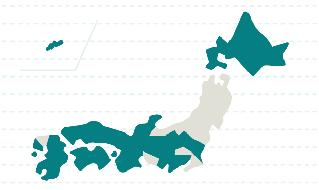 北海道、茨城、栃木、群馬、東京、神奈川、石川、福井、山梨、長野、岐阜、静岡、三重、滋賀、京都、大阪、兵庫、奈良、和歌山、鳥取、島根、岡山、広島、山口、徳島、香川、愛媛、高知、福岡、長崎、熊本、大分、宮崎、鹿児島、沖縄