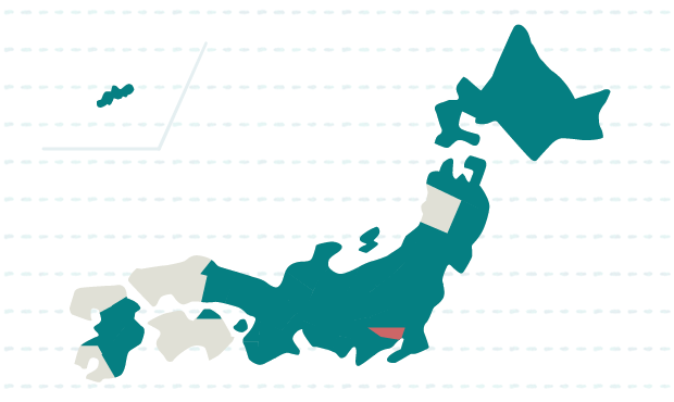 北海道、青森、岩手、宮城、山形、福島、茨城、栃木、群馬、埼玉、千葉、東京、神奈川、新潟、富山、石川、福井、山梨、長野、岐阜、静岡、愛知、三重、滋賀、京都、大阪、兵庫、奈良、和歌山、鳥取、岡山、香川、熊本、大分、宮崎、沖縄