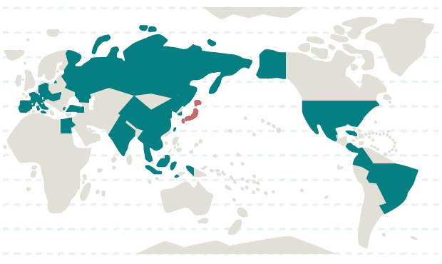 日本、インド、インドネシア、韓国、カンボジア、タイ、台湾、中国、ベトナム、マレーシア、ミャンマー、ラオス