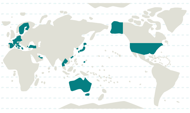 イタリア、オランダ、スウェーデン、スペイン、チェコ、ドイツ、トルコ、バチカン、フィンランド、フランス、ベルギー、マルタ、ルクセンブルク