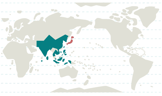 日本、アフガニスタン、イギリス領インド洋地域、インド、インドネシア、韓国、カンボジア、北朝鮮、シンガポール、スリランカ、タイ、台湾、中国、ネパール、パキスタン、パラセル諸島、バングラデシュ、東ティモール、フィリピン、ブータン、ブルネイ、ベトナム