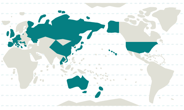 アイルランド、イギリス、イタリア、オランダ、ギリシャ、クロアチア、スイス、スペイン、セルビア、チェコ、ドイツ、バチカン、フランス、ベルギー、ポルトガル、マルタ、ルクセンブルク、ロシア