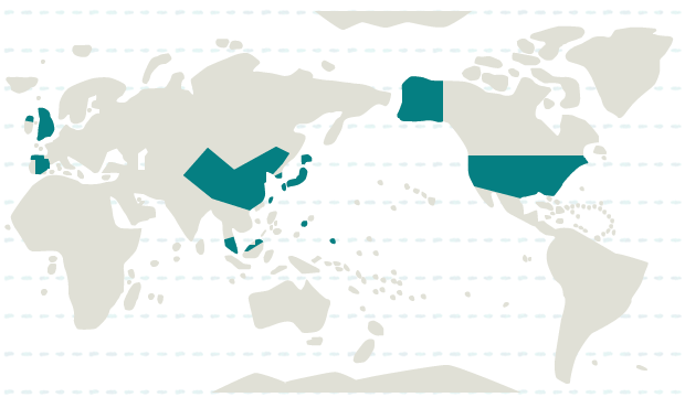日本、韓国、シンガポール、台湾、中国、マレーシア
