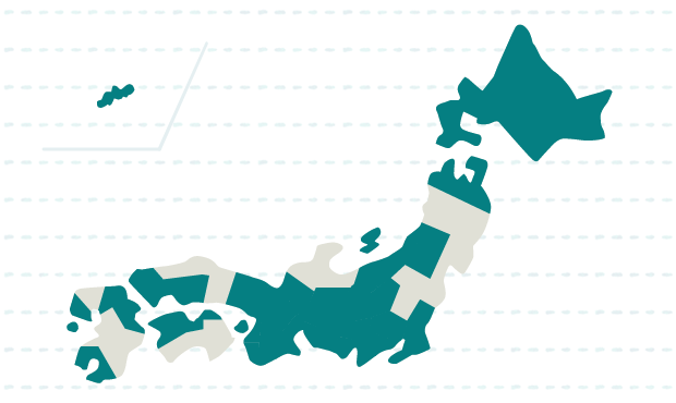 北海道、青森、山形、茨城、群馬、埼玉、千葉、東京、神奈川、新潟、福井、山梨、長野、岐阜、静岡、愛知、三重、滋賀、京都、大阪、兵庫、奈良、和歌山、広島、山口、香川、愛媛、福岡、長崎、大分、鹿児島、沖縄