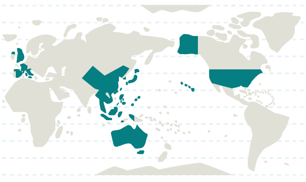 日本、インドネシア、韓国、カンボジア、シンガポール、タイ、台湾、中国、フィリピン、ベトナム、香港、マカオ、マレーシア、ミャンマー