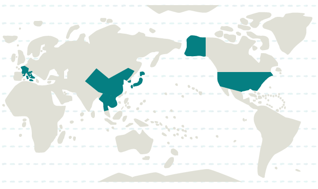 日本、韓国、カンボジア、タイ、中国、ベトナム、ミャンマー、ラオス