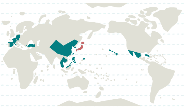日本、韓国、カンボジア、タイ、台湾、中国、フィリピン、マレーシア