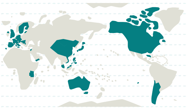 イギリス、イタリア、エストニア、オーストリア、オランダ、スイス、スウェーデン、スペイン、スロベニア、セルビア、チェコ、ドイツ、バチカン、ハンガリー、フィンランド、フランス、ポルトガル、ラトビア