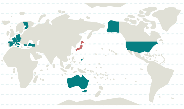 イタリア、オーストリア、ギリシャ、スイス、スペイン、スロベニア、チェコ、ドイツ、トルコ、フィンランド、フランス、ベルギー