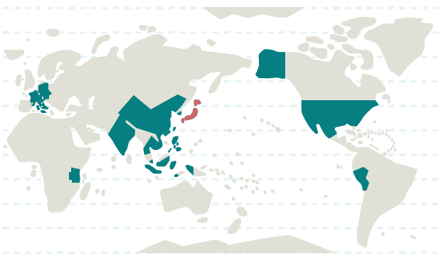 インド、インドネシア、韓国、シンガポール、タイ、台湾、中国、フィリピン、ベトナム、香港、マカオ、日本、カンボジア