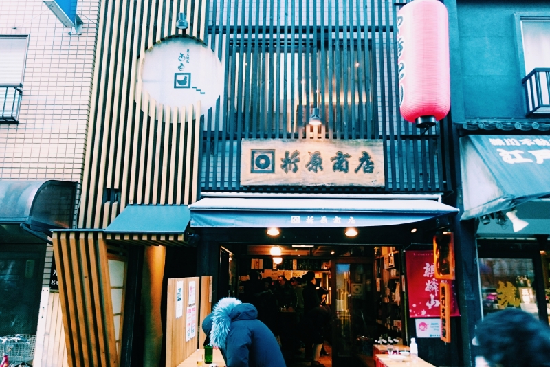 お酒の種類が豊富!立ち飲みスタイルの店内は壁一面、お酒が並ぶ冷蔵庫に囲まれています。入口付近には駄菓子も並べてあり、入りやすい雰囲気。お参りの後に、こちらでちょっと1杯!大人のお散歩コースにぴったりです。