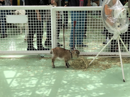 1日2回行われる「ふれあいコーナー」は、園内で一番賑わう大人気のスポットです。こちらではウサギ、ジャンボウサギのふくちゃん、モルモット、シャモ、ウコッケイ、チャボ、コールダック(小型のアヒル)、ヤギ、ヒツジと触れ合うことができます。