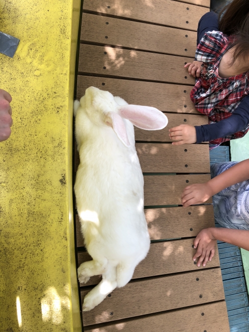 写真:Noz「自然動物園」にあるふれあいコーナーにいるジャンボウサギ。迫力のある姿に子供たちもタジタジ?