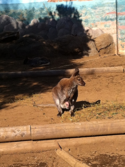 写真:Noz「自然動物園」にあるベネットアカクビワラビーの野外展示場。お母さんのおなかの袋から赤ちゃんが顔を出しています