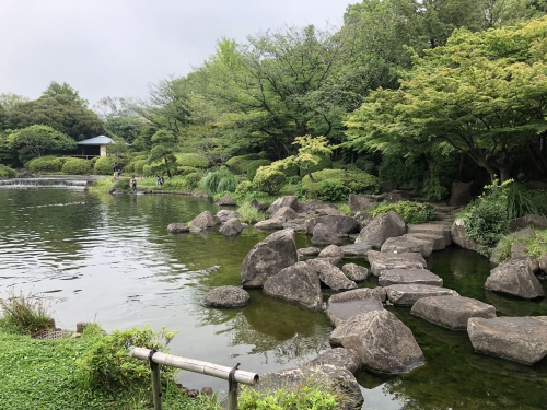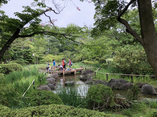 行船公園内にある、築山池泉回遊式庭園(つきやまちせんかいゆうしきていえん)と呼ばれる造りの日本庭園です。日本庭園の形式のひとつで、中心にある大きな池、そして築山(人工的につくられた山)や橋、岩などで景勝を再現し、周りを巡る散策路を回遊して鑑賞を楽しむという庭園です。
