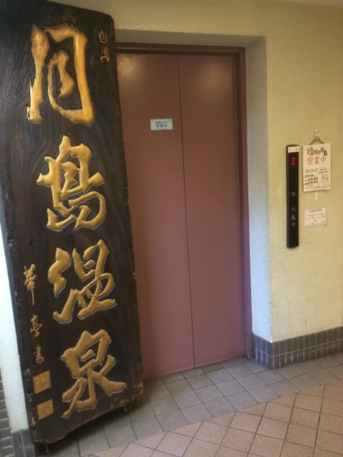 月島観音は、月島温泉の入口につながるビルのエレベーターの横に安置されています。気づかずに通り過ぎてしまいがちですが、サインを見つけてビルの入口を入ると提灯が連なっており、参道である事がわかります。
