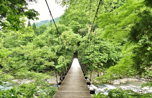津南駅から車で約25分の場所に位置する見倉橋。新潟の橋50選にも選ばれた場所です。駐車場から山を下っていくので歩きやすい靴がオススメ。秋には色づく紅葉と中津川渓谷の両方を楽しめ、マイナスイオンもたっぷりのオススメスポットです。天然の木を使ったつり橋は、一足踏み出せばドキドキもの。