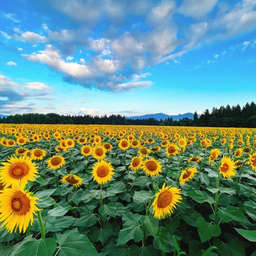 津南町の高台約4haという広大な敷地にヒマワリ畑が広がっています。平成2年に津南の青年たちが遊休農地50rを利用して、ひまわりの作付けを始めたそうです。その後、反響が大きく観覧者が多数訪れたことで、平成5年から町観光協会が主催となり、現在では約50万本のヒマワリが咲いています。例年の開花時期は、7月下旬から8月中旬です。