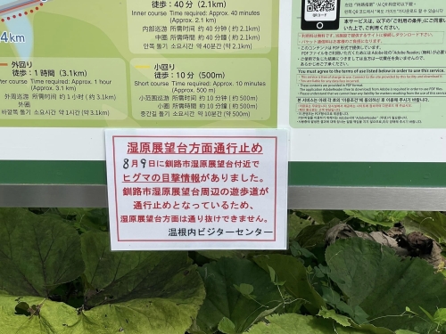 筆者たちが訪れた際には釧路湿原展望台付近でヒグマの目撃情報があったとのことで、周辺の遊歩道が通行止めになっていました。