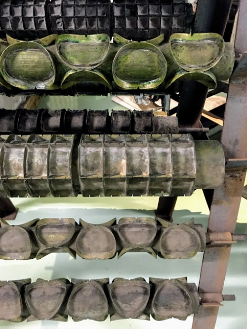 機械で蒸された米粉がほかほかの餅のような状態で機械から出てきたり、シート状に薄く伸ばした生地を機械で型抜きしたり・・。残念ながら製造ラインの撮影はできませんが、めったに見られないせんべい作りの様子に思わず目がくぎ付けです!