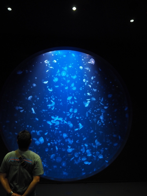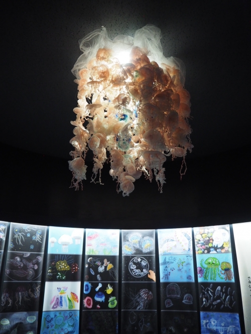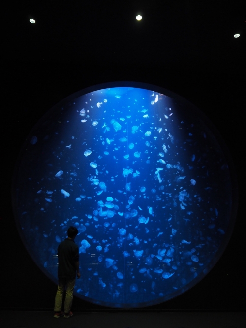 直径5メートルもあるこの巨大水槽はクラゲの展示水槽としては世界最大級。その中には約2,000匹の水クラゲがふわりふわりと漂っています。「幻想的」以外の言葉が思い浮かばないほどの雰囲気でうっとりしてしまいます。