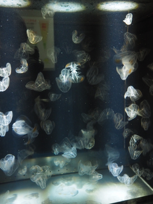 この給餌解説は1回30分くらいで、そもそもクラゲって何?ということから解説が始まり、クラゲの一生(どのようにクラゲが生まれて「赤ちゃんクラゲ」から「大人クラゲ」になるのか)、クラゲが何をどのように食べるのか、ということを解説してくれます。