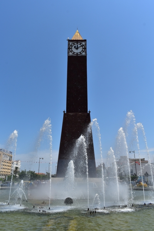 ハビブ・ブルギバ通りの歩道を地中海へ向かって歩いていくと、こちらの時計塔があります。周りは噴水になっており、これといって特長もないのですが、多くの人が座って寛いでいます。