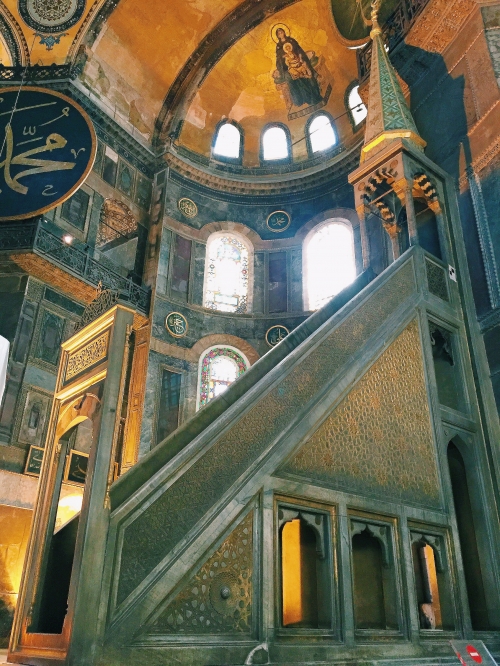 ギリシア正教の大本山として人々の信仰を集めましたが、メフメト2世が1453年にコンスタンティノープル(現イスタンブール)を攻略して以来、聖堂はモスクに改修され、ムスリム(イスラム教徒)の祈りの場となりました。その後、トルコ共和国初代大統領のアタテュルクによって、モスクは博物館に転用され、一般公開されています。