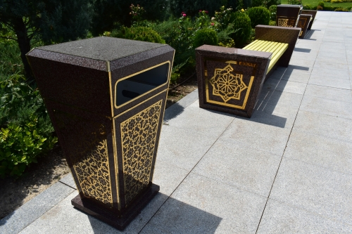 Ashgabatには大小様々、かなりの数の公園がありますが、公園ごとに全てのベンチのデザインが異なるうえ、同デザインのごみ箱が必ずベンチの隣に一つずつ配されています。これらは、政府が国内外のデザイン会社へ公募をかけ、その公園に見合ったものを選ぶのだそうです。