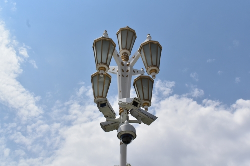 この付近は、警察が等間隔で警備にあたっており、事情を知らない旅行者がブラブラ歩いているとすぐに警察が近寄ってきます。監視体制は厳しく、歩行者のみならず道路を走る一般車両も監視されています。美しい街灯も、よく見ると監視カメラが5つも!!