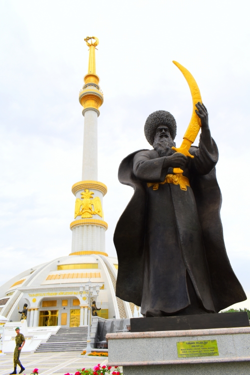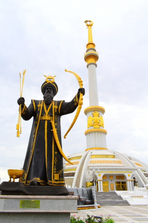 この塔の周囲には、トルクメニスタンを代表する27人の指導者像があり、それぞれが黄金に輝く伝統文化に由来する物を持っています。