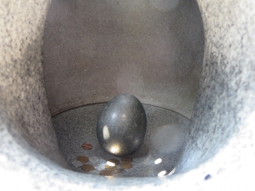 兎が抱えている60cmの玉に穴が2つ開いています。それぞれの穴から両手を差し入れ、中にある重い石の卵を立てて置くことができれば運気が上がり足腰も健康になるそうです。バランスを取るのが難しいですがチャレンジしてみましょう。