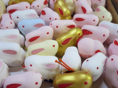 境内には兎の像が沢山ありますが、どうやら昔、道に迷った時に兎が振り返って道案内をしたのだとか。以来、正しい道・良縁へ導いてくれるというご利益があるそう。みかえり兎のおみくじ(300円)もあります。首の角度や、一つ一つ手描きの顔の絵付けが違いますので、直感で選んでみてくださいね。うさぎ御守りや絵馬(各500円~)もあります。
