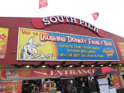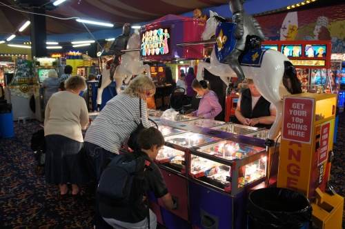 ピア入口付近の屋内にはゲームやミニカジノがあり、その先は遊園地になっています。イギリスのカジノは高額をかけるゲーム機は大人専用ですが、2ペニーなどの少額で遊べる機械は子供も遊べるので、おこづかいを増やそうと、子供達が夢中で遊んでいます。